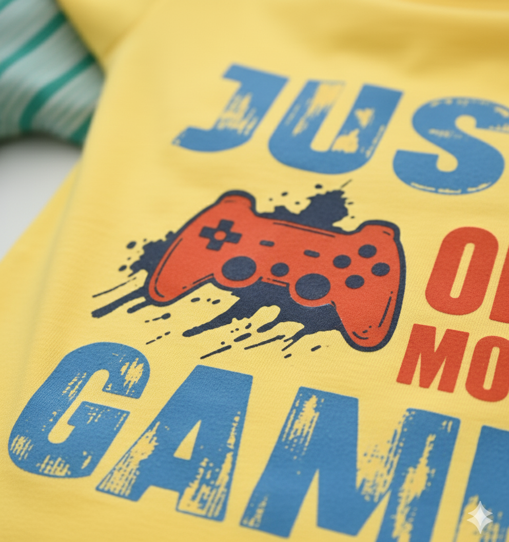The t-shirt is a bright yellow, featuring an exciting gaming print that’s sure to delight little gamers..