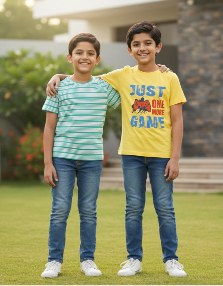 This 2-piece combo set of kids t-shirts is crafted from soft, breathable pure cotton, perfect for active kids who love comfort and style. Each t-shirt features short sleeves and a classic round neck, offering a relaxed and easy fit.