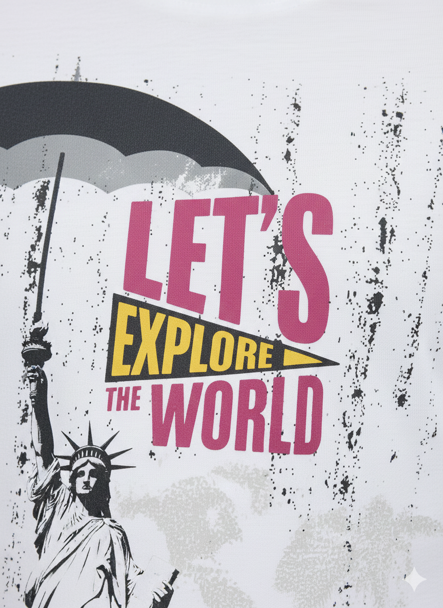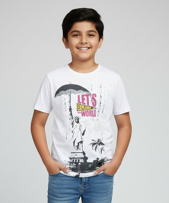 White Explore The World Printed Round Neck Cotton T-shirt