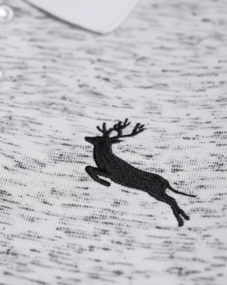 A piece that makes a statement in more ways than one. This polo has an all over self print and a playful deer embroidery on the chest.